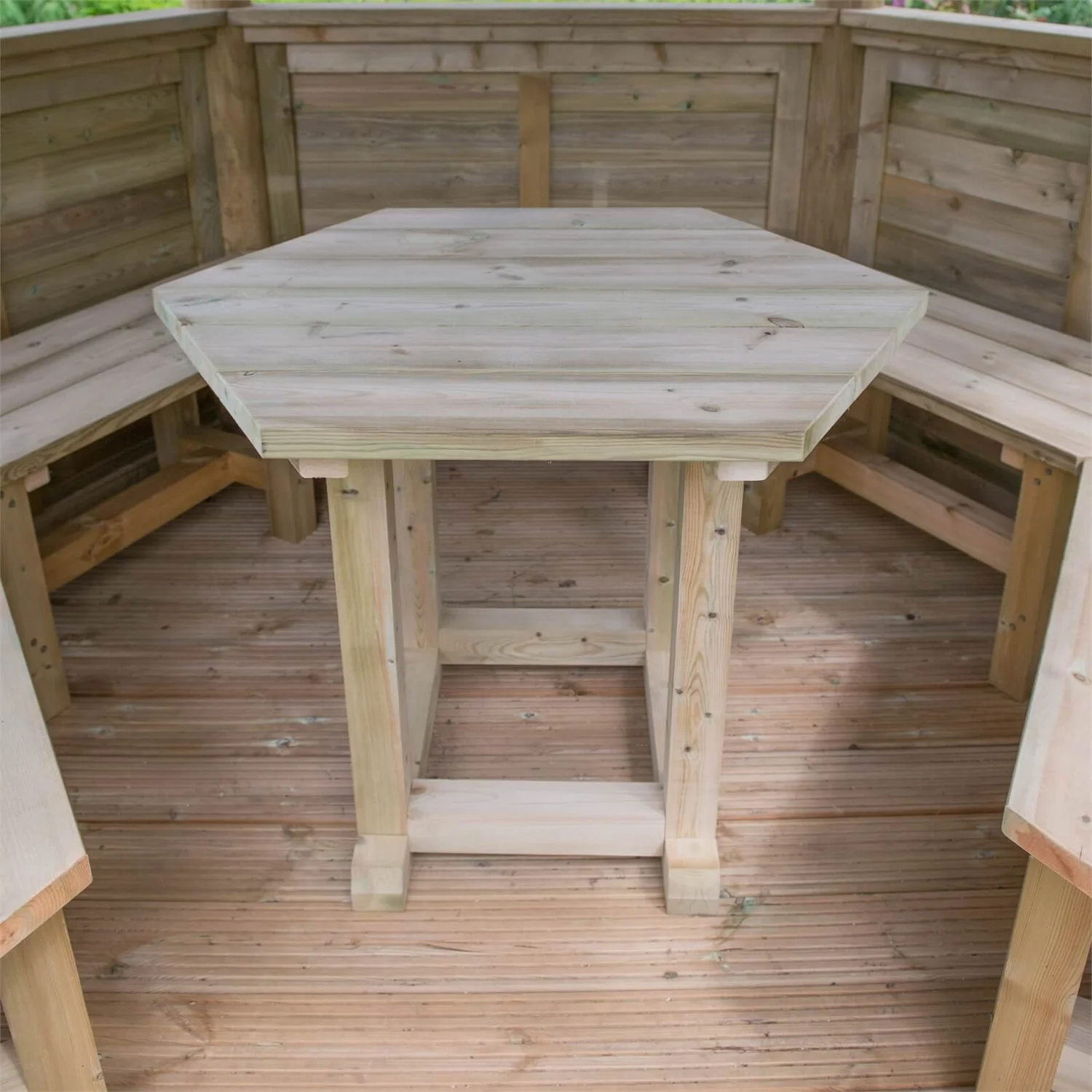 - Includes a hexagonal table and set of 5 matching bench seats that can accommodate up to 10 adults or 12 children